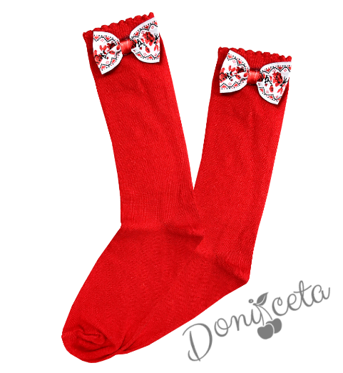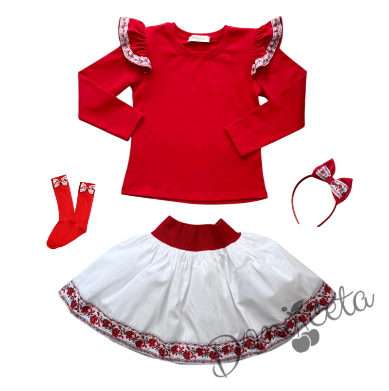 Начало МОМИЧЕТА Комплект за момиче за баба Марта от 4 части-пола в бяло, блуза в червено с къдрици с фолклорни/етно мотиви, чорапи в червено с панделка с етно мотиви и диадема