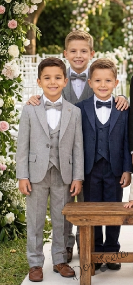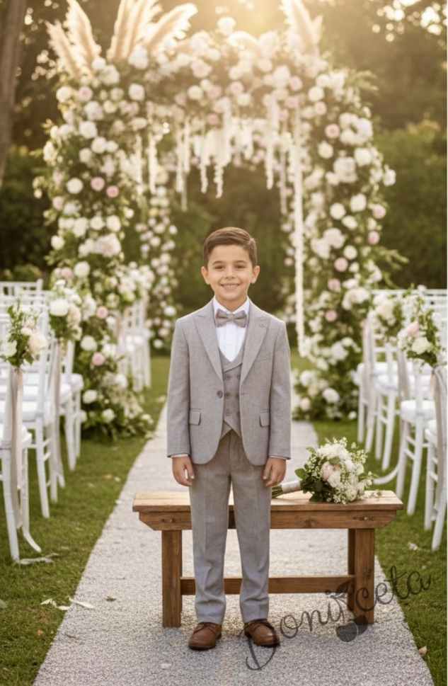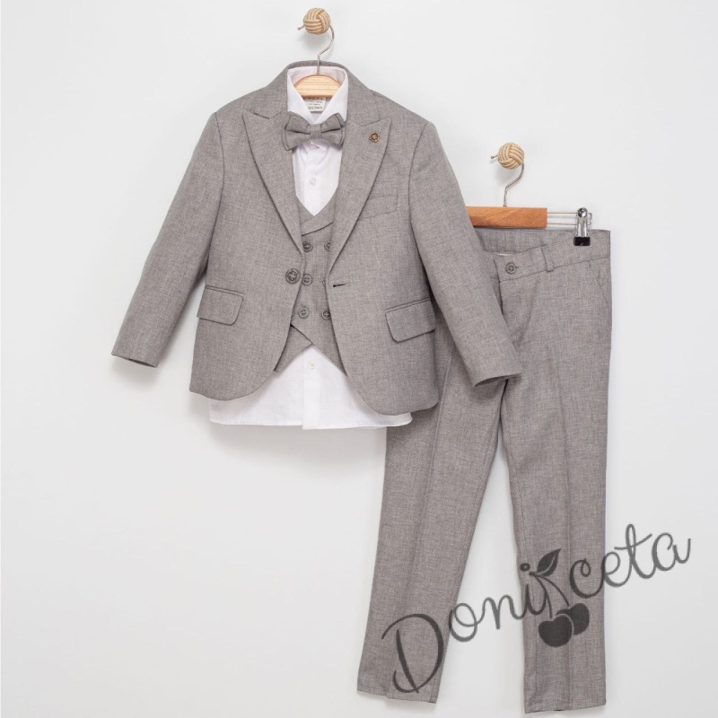 Официален костюм в сиво за момче от 5 части с риза, сако, елек, панталон и папийонка