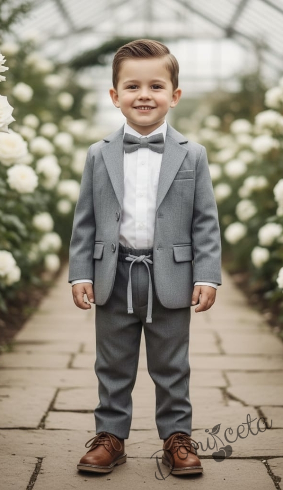 Спортно-елегантен костюм за момче от 4 части в сиво - риза в бяло, сако с джобове, панталон с връзки и папийонка
