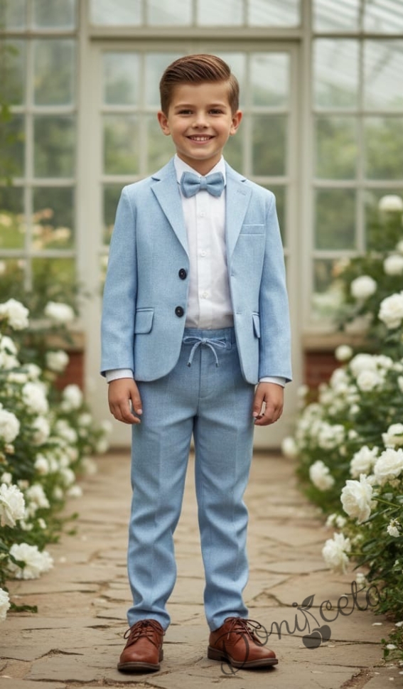 Спортно-елегантен костюм за момче от 4 части в светлосиньо - риза в бяло, сако с джобове, панталон с връзки и папийонка