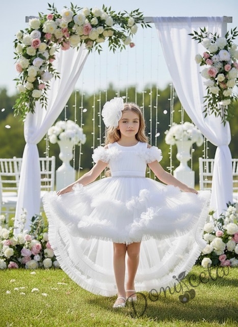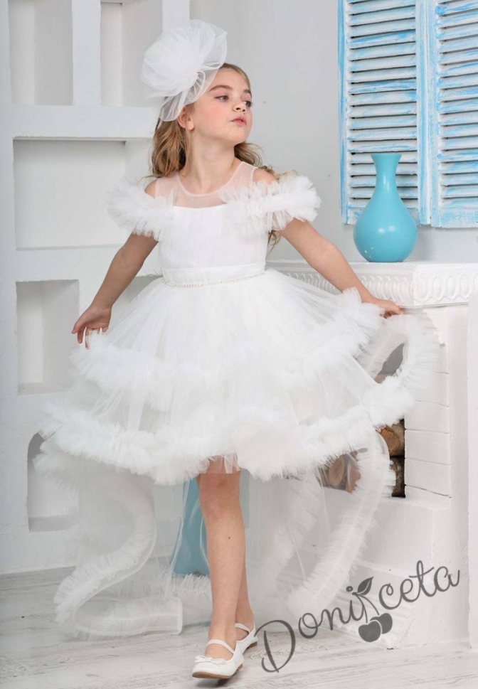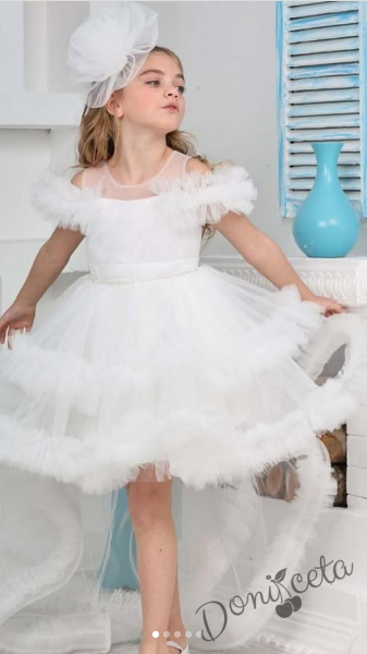 Официална детска рокля Даная в бяло с ефирен тюл на пластове, шлейф и фиба за коса