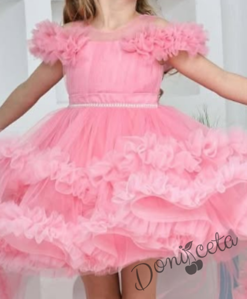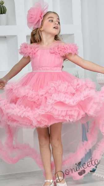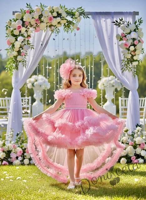 Детска официална рокля Даная в бонбонено розово с ефирен тюл на пластове, шлейф и фиба за коса от колекция Розовина