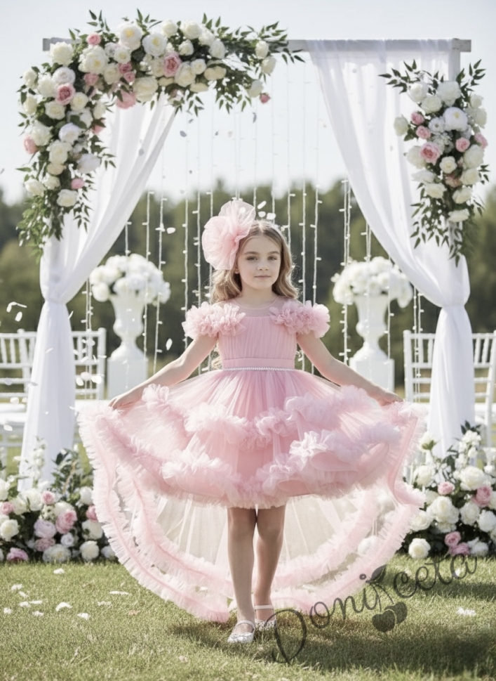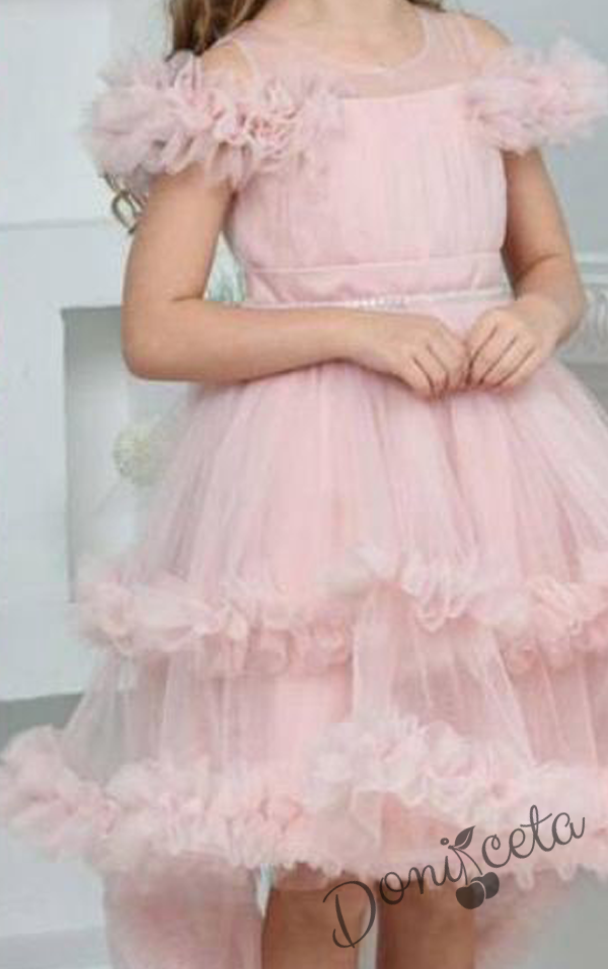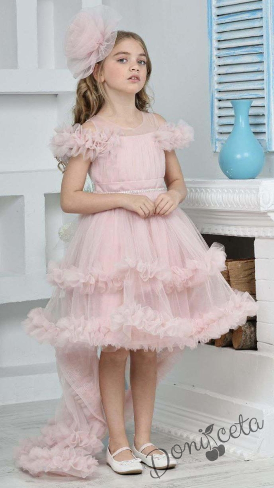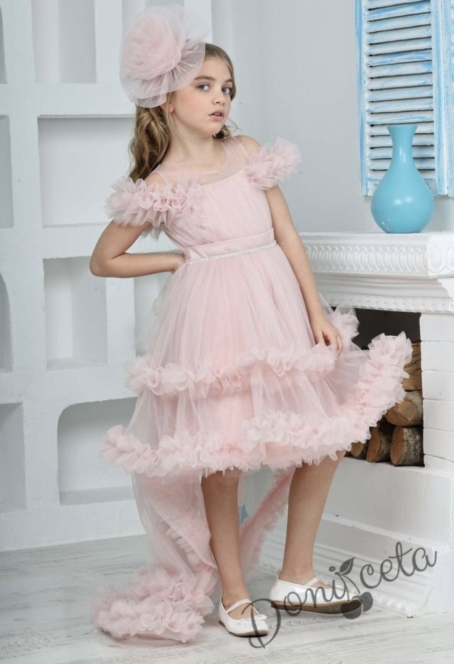 Официална рокля Даная в прасковено с ефирен тюл на пластове, шлейф и фиба за коса
