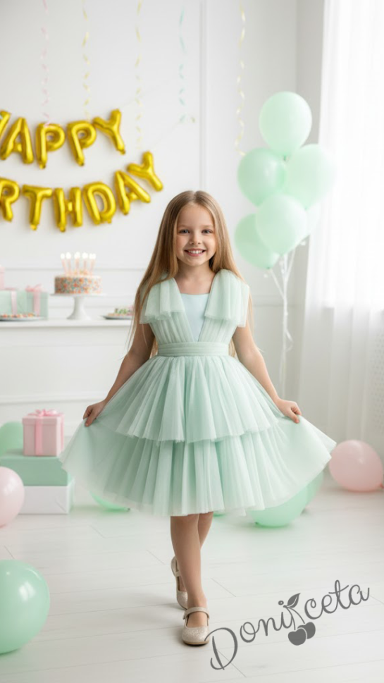 Официална празнична детска рокля с тюл в цвят тюркоаз