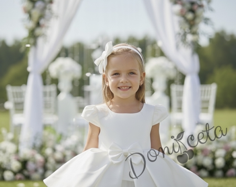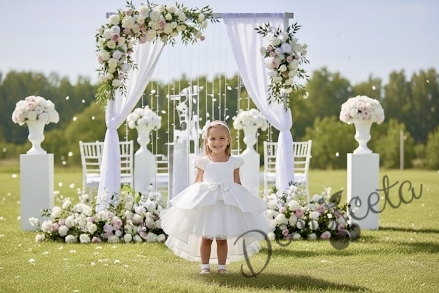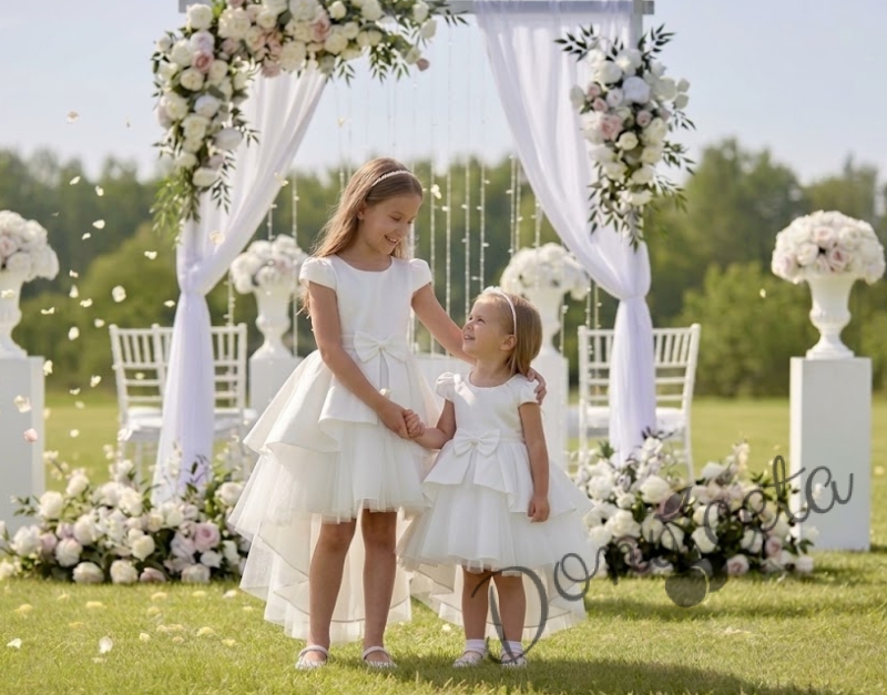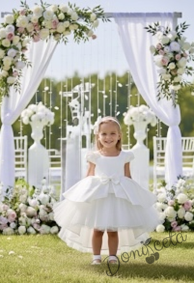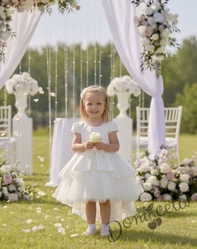 Официална детска рокля от плат Мариска с къс ръкав в екрю и тюл и шлейф