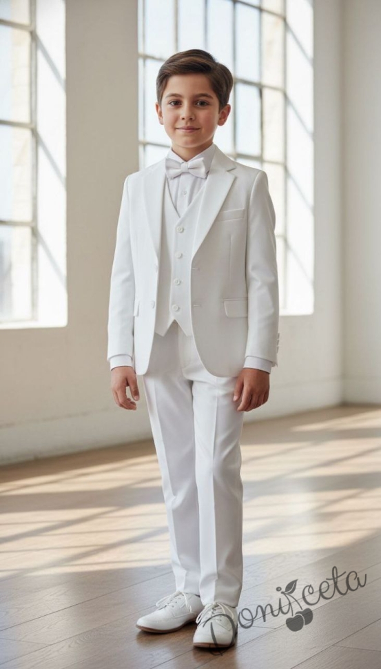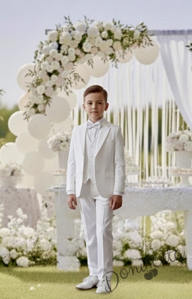 Официален костюм за момче в бяло- сако, панталон, елек, риза и папийонка от колекция Снежина