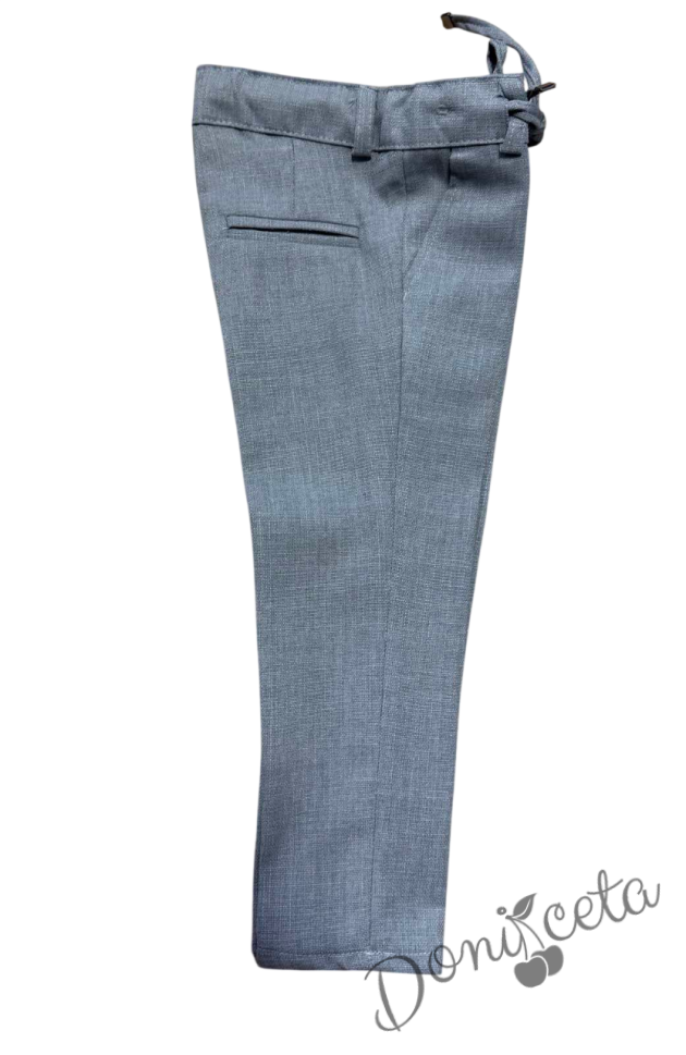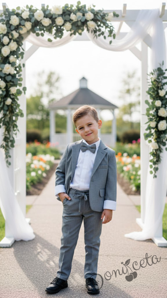 Спортно-елегантен костюм за момче в светло сиво от 4 части риза в бяло, сако с джобове, панталон с връзки и папийонка