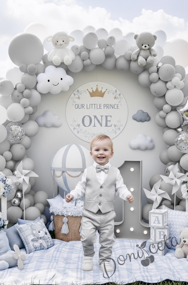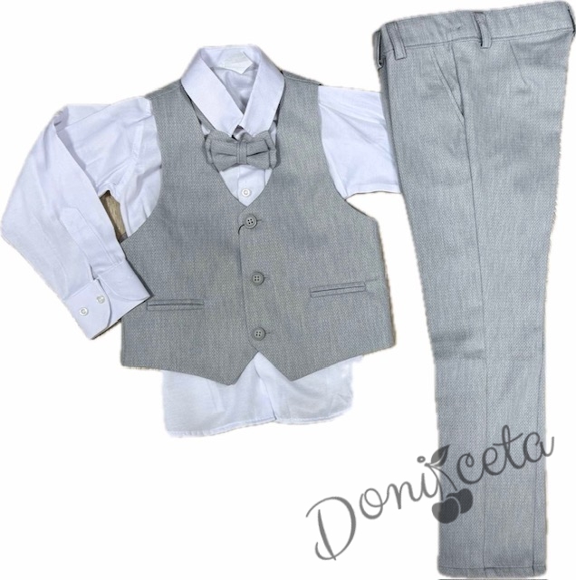 Официален елегантен костюм в сиво за момче от 4 части елек, риза в бяло, панталон и папийонка