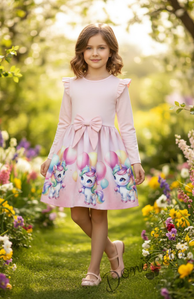Детска рокля с дълъг ръкав в цвят пудра с къдрички, панделка и еднорог