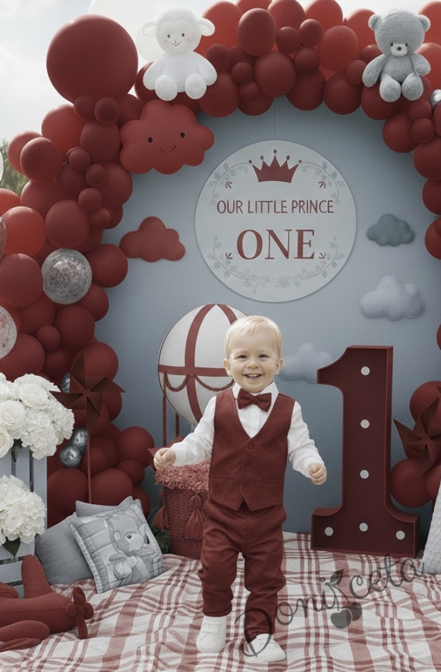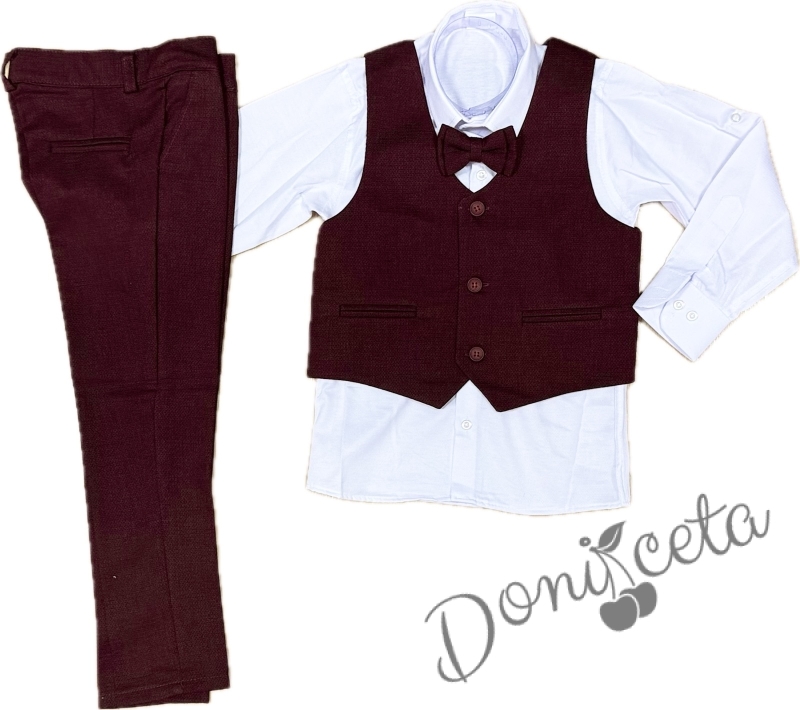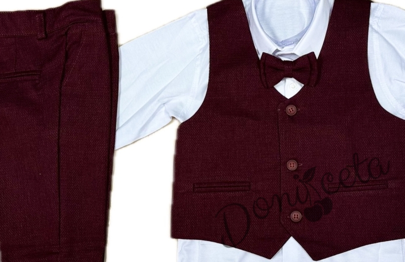 Стилен официален комплект в бордо за момче от 4 части елек, риза в бяло, панталон и папийонка от колекция Бордолина