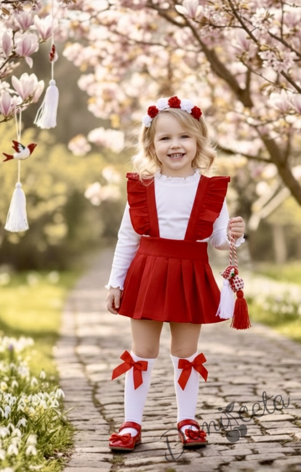 Комплект трико за момиче от сукман в червено Гери с къдрички в и бяла блузка с дълъг ръкав