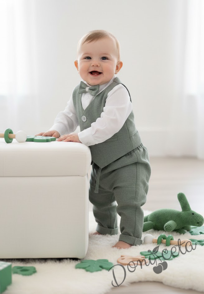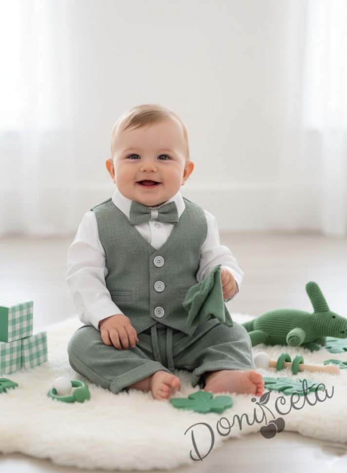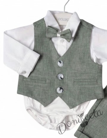 Бебешки комплект от 4 части боди-риза в бяло, панталон, елек и папийонка в зелено