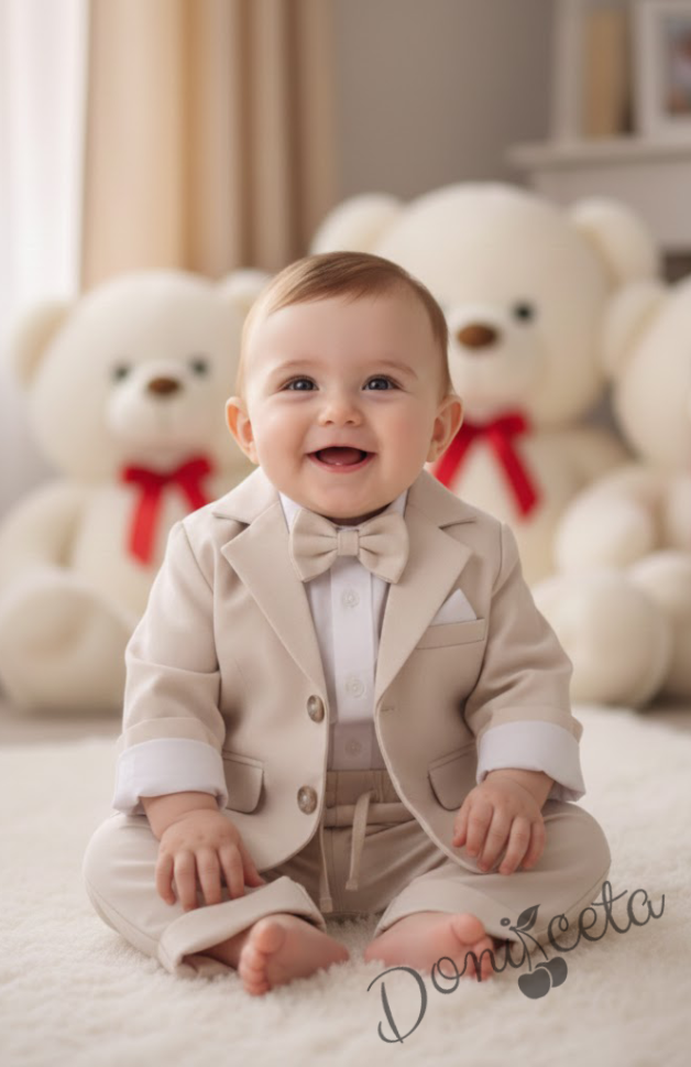 - Стилен комплект за момче от 4 части - боди-риза в бяло с панталон, сако и папийонка в екрю.