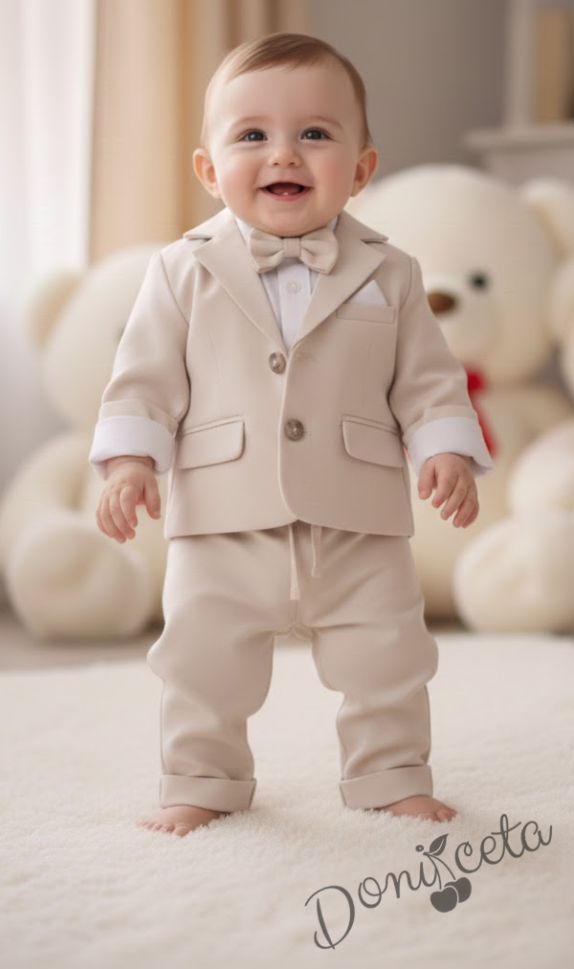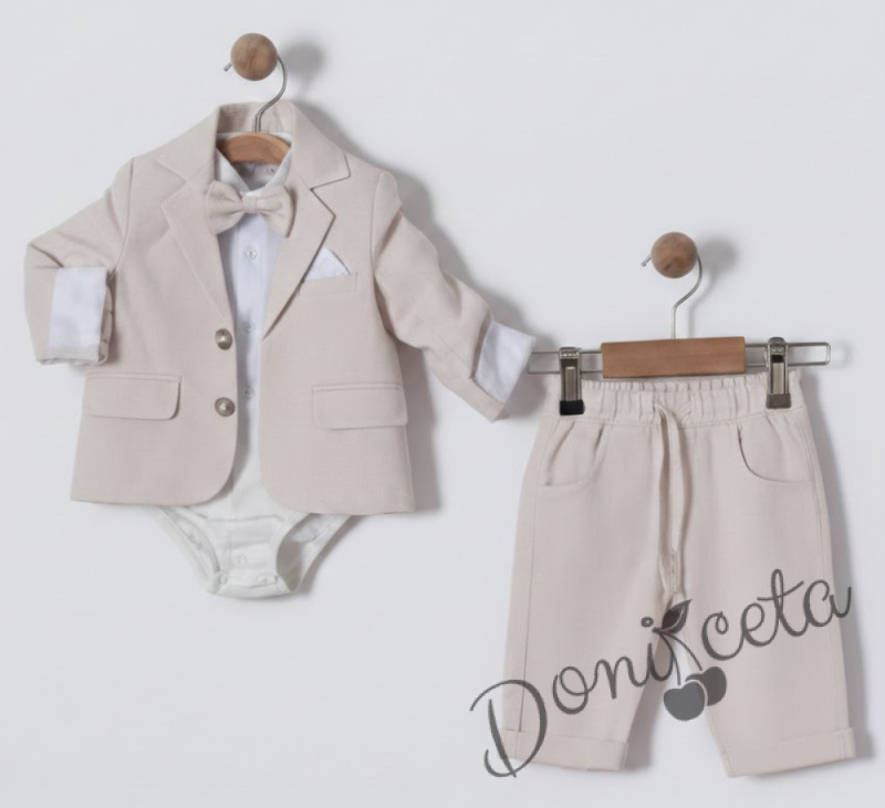 Бебешки комплект за момче от 4 части- боди-риза в бяло с панталон, сако и папийонка в екрю