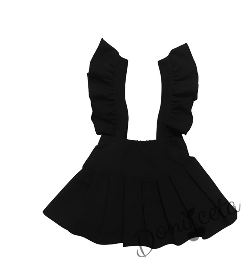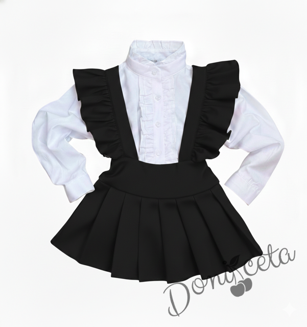 Комплект за момиче от плисиран сукман Гери трико в черно и риза в бяло с дълъг ръкав с висока яка