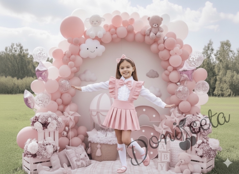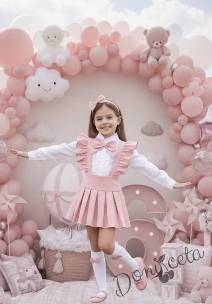 Комплект за момиче от 3 части- сукман Гери в розово с плисирана пола, риза в бяло с дълъг ръкав и къдрички и панделка в розово