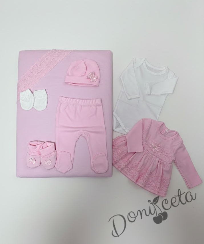 Комплект за изписване за момиче от 7 части в розово с дантела