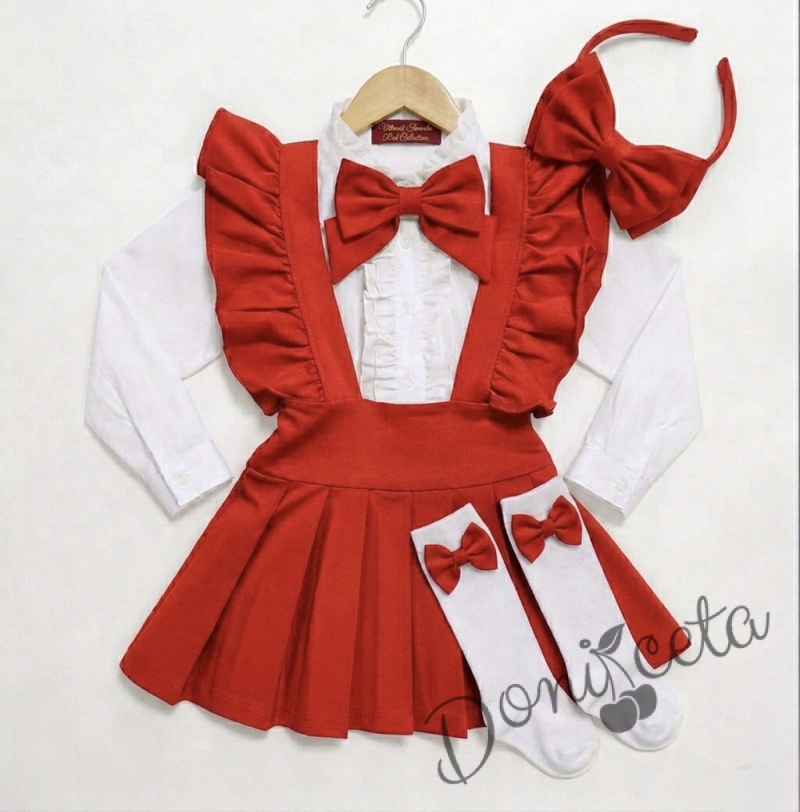 Комплект за момиче от 5 части- сукман Гери в червено с плисирана пола, риза в бяло с дълъг ръкав и къдрички ,панделка за ризка и чорапки и диадема в червено