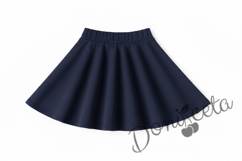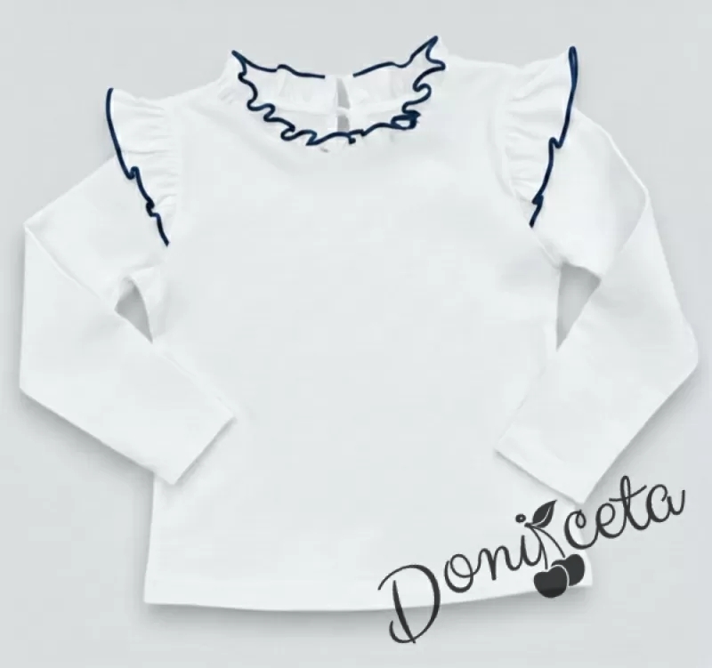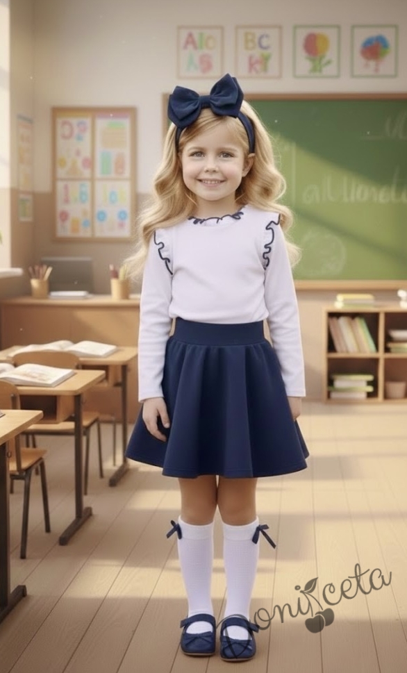 Комплект за момиче от 2 части-пола клош от трико Роси в тъмносиньо и блуза с дълъг ръкав с къдрички в бяло обкрайчени с тъмносиньо