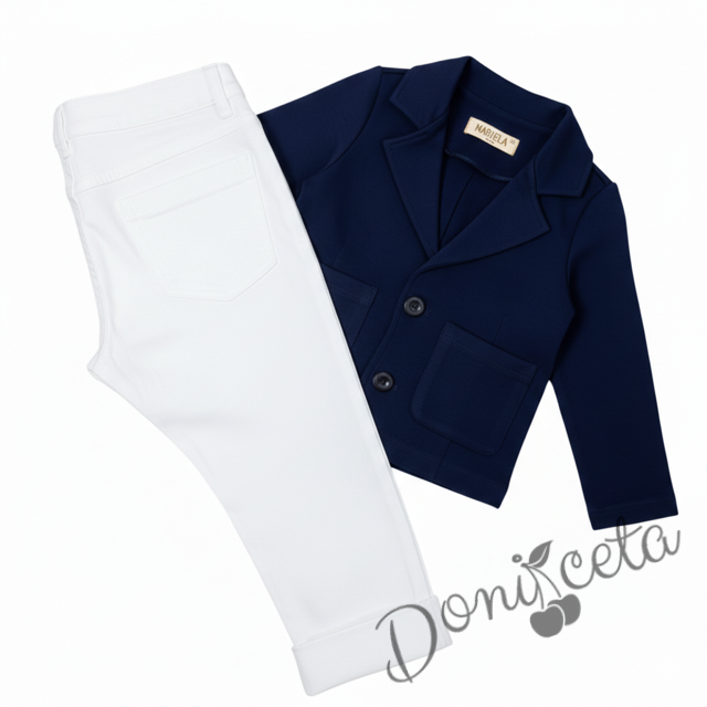 • Комплект от модерно детско сако в тъмносиньо за момче и бял прав панталон..