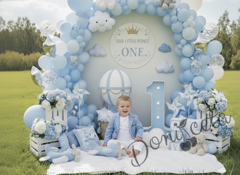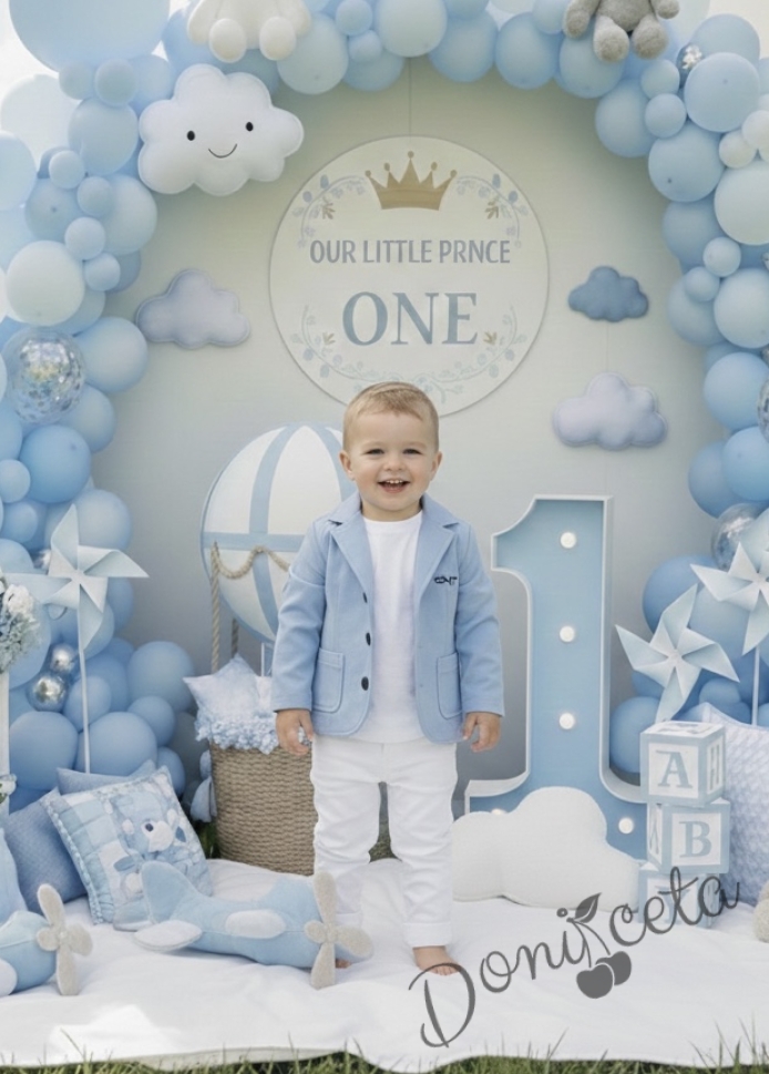 • Комплект от модерно детско сако в светлосиньо за момче и бял прав панталон.