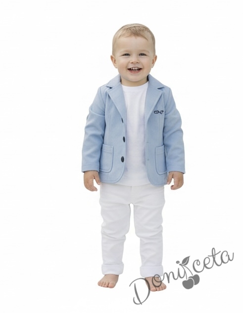 Комплект от детско сако трико за момче в светлосиньо с джобчета и панталон в бяло