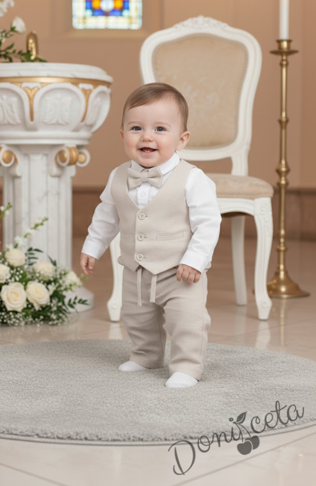 Бебешки спортно-елегантен комплект от боди-риза в бяло, панталон, елек и папийонка в екрю