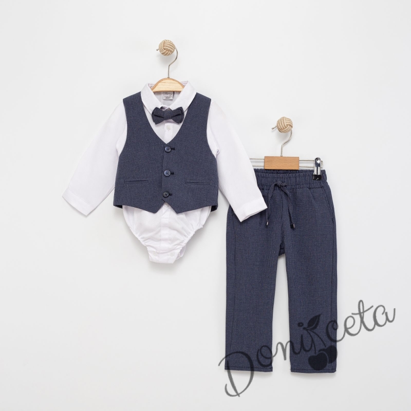 Бебешки спортно-елегантен комплект от боди-риза в бяло съчетано с панталон, елек и папийонка в тъмносиньо