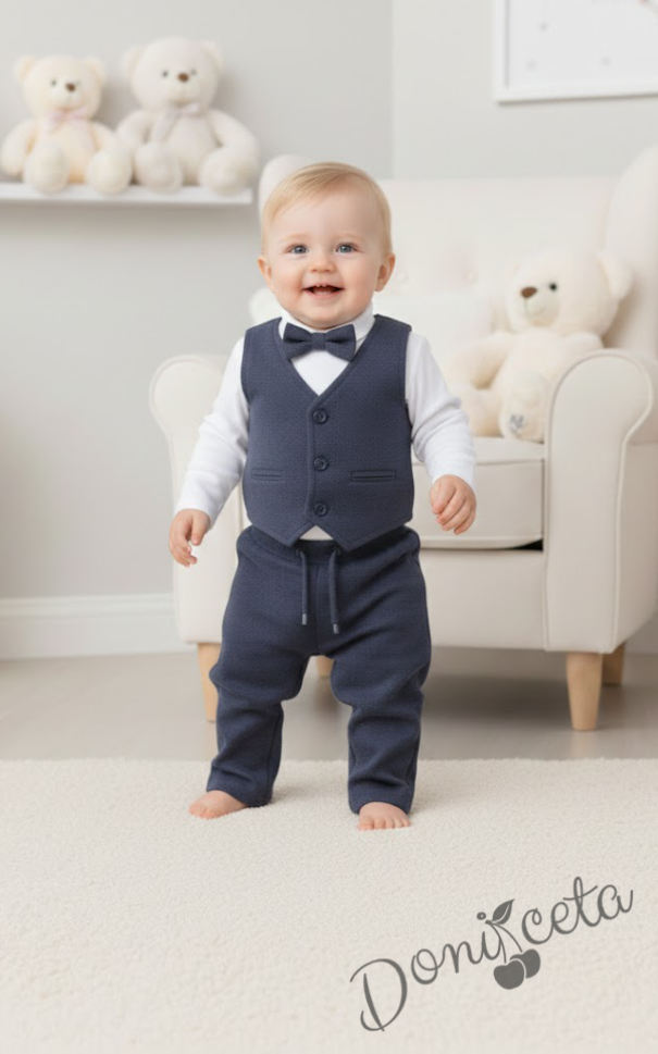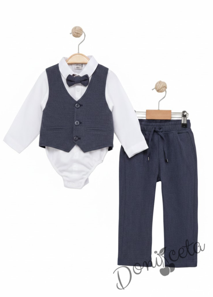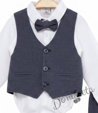 Бебешки спортно-елегантен комплект от боди-риза в бяло, панталон, елек и папийонка в тъмносиво