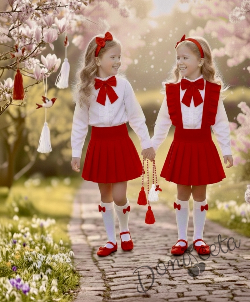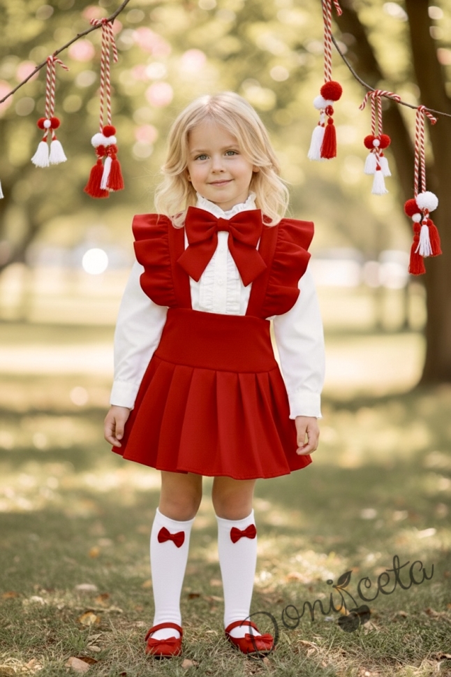 Комплект за момиче от 4 части- сукман Гери от трико в червено, риза в бяло с дълъг ръкав и къдрички, панделка в червено за ризаката и диадема