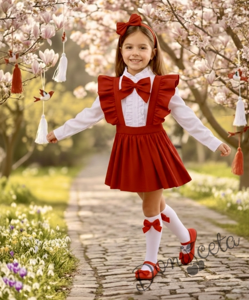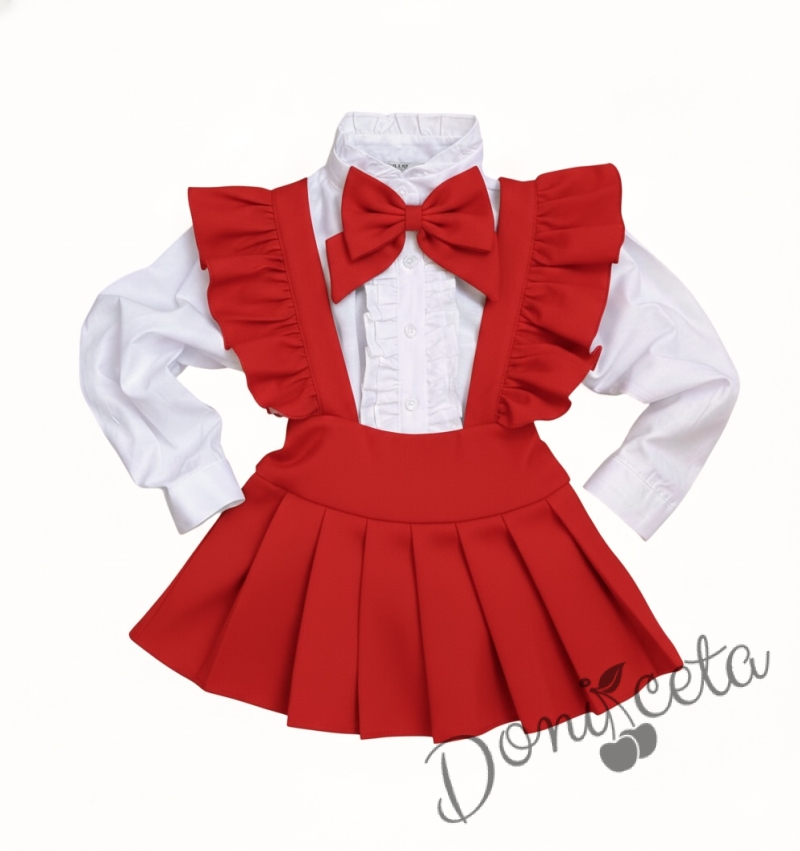 Комплект за момиче от 4 части- сукман от трико Гери в червено, риза в бяло с дълъг ръкав и къдрички, панделка в червено за ризаката и диадема