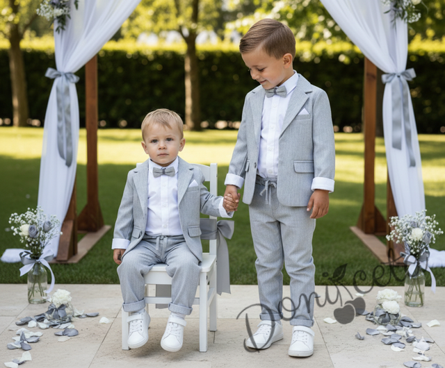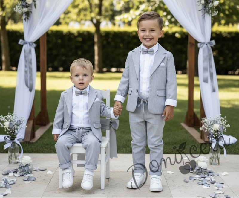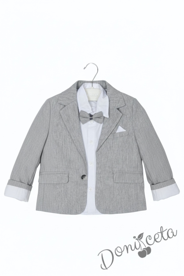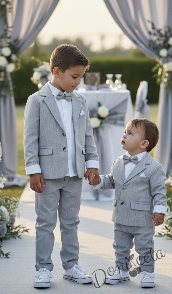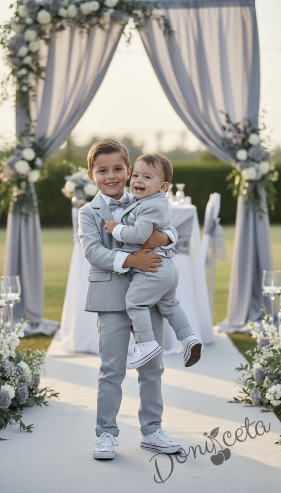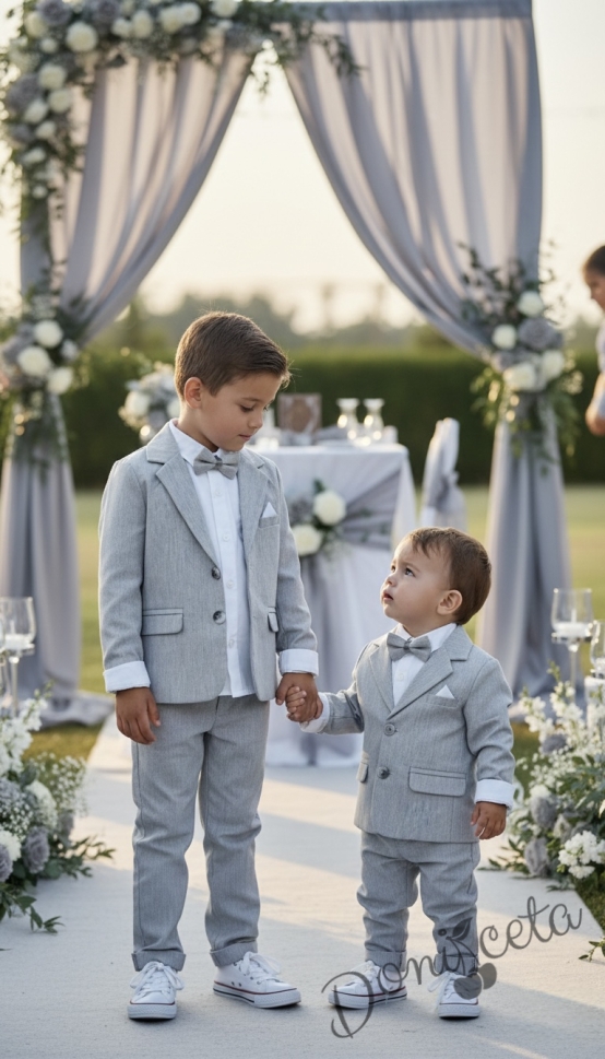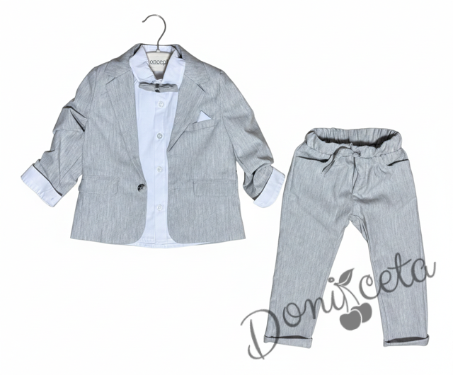 Официален летен костюм за момче в сиво от 4 части - сако, панталон, риза в бяло и папийонка