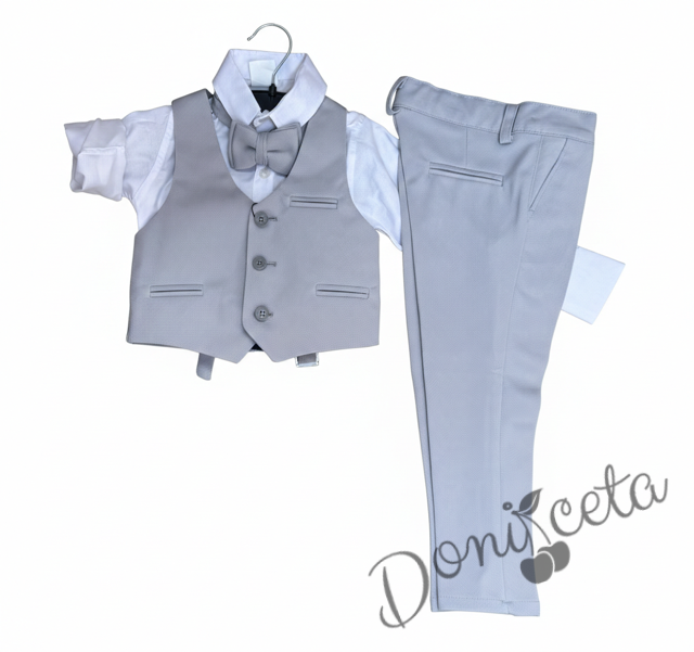 Официален костюм момче от елек в сиво, риза в бяло, панталон и папийонка