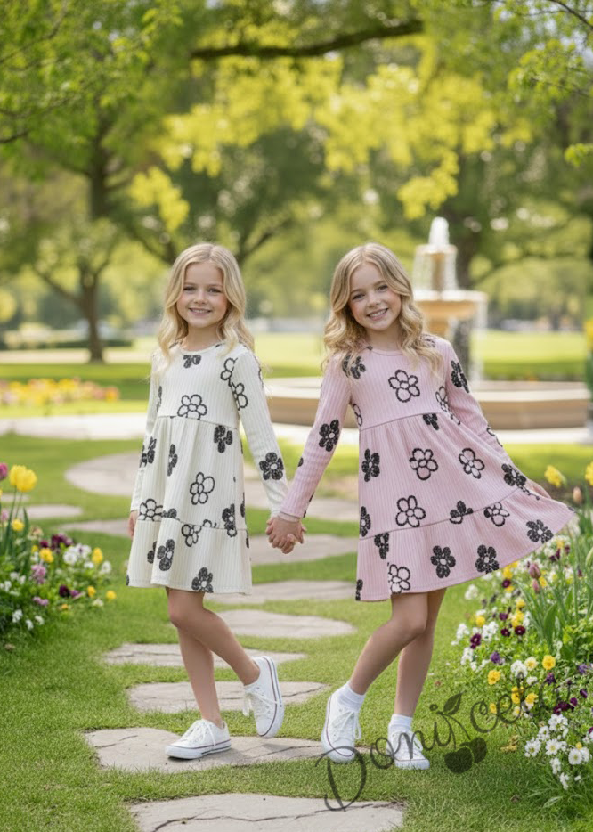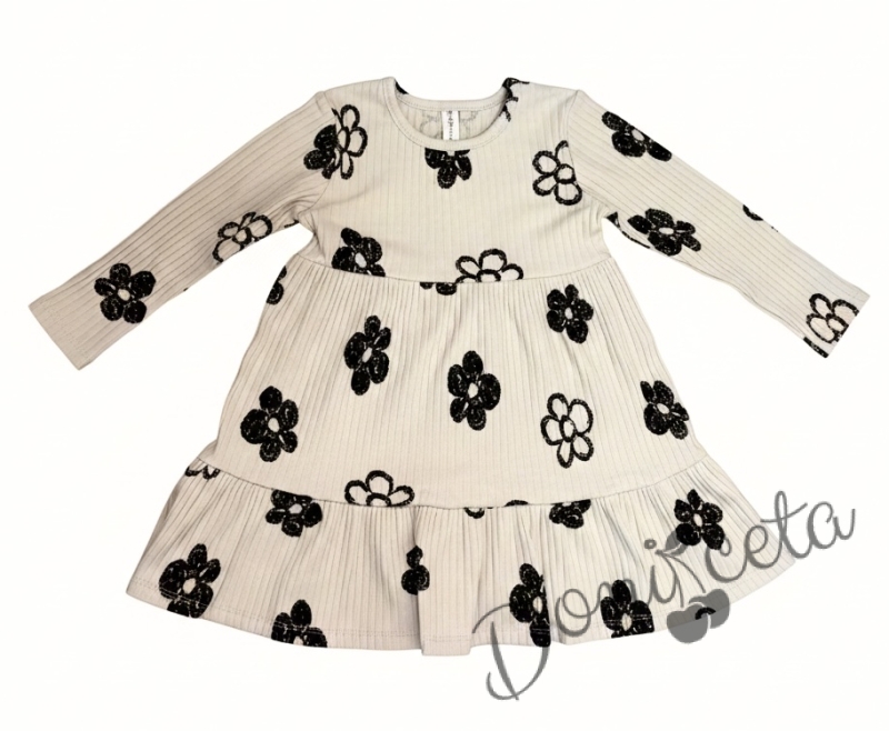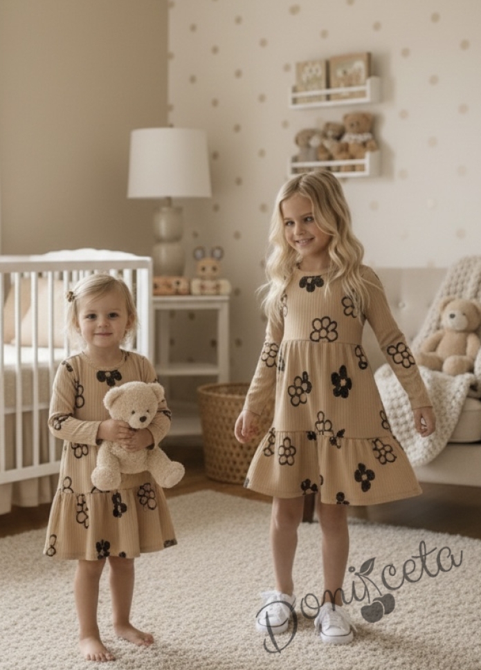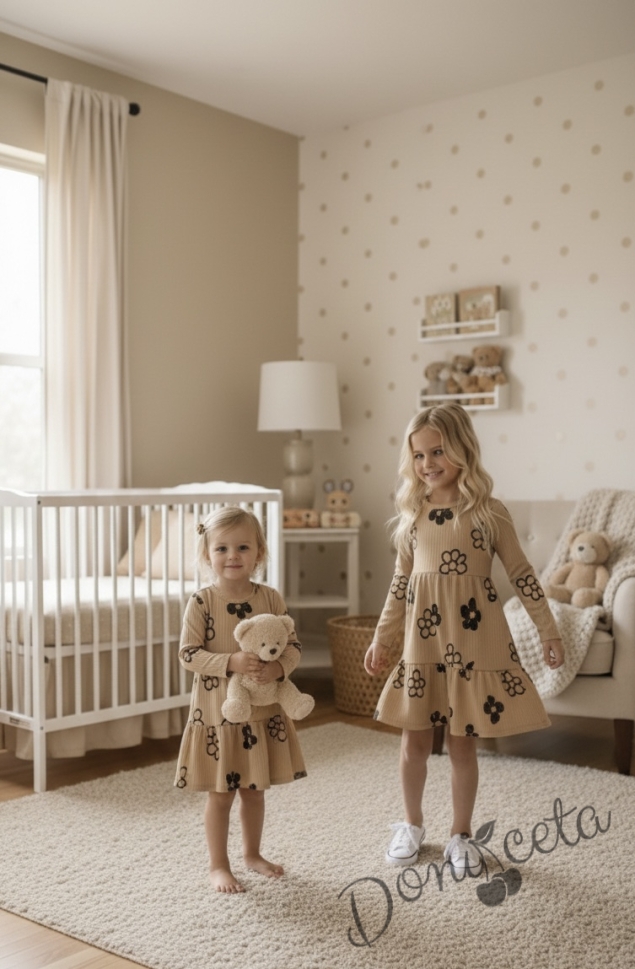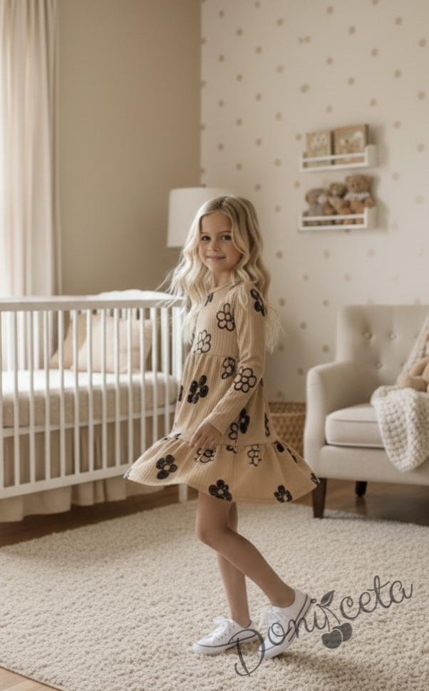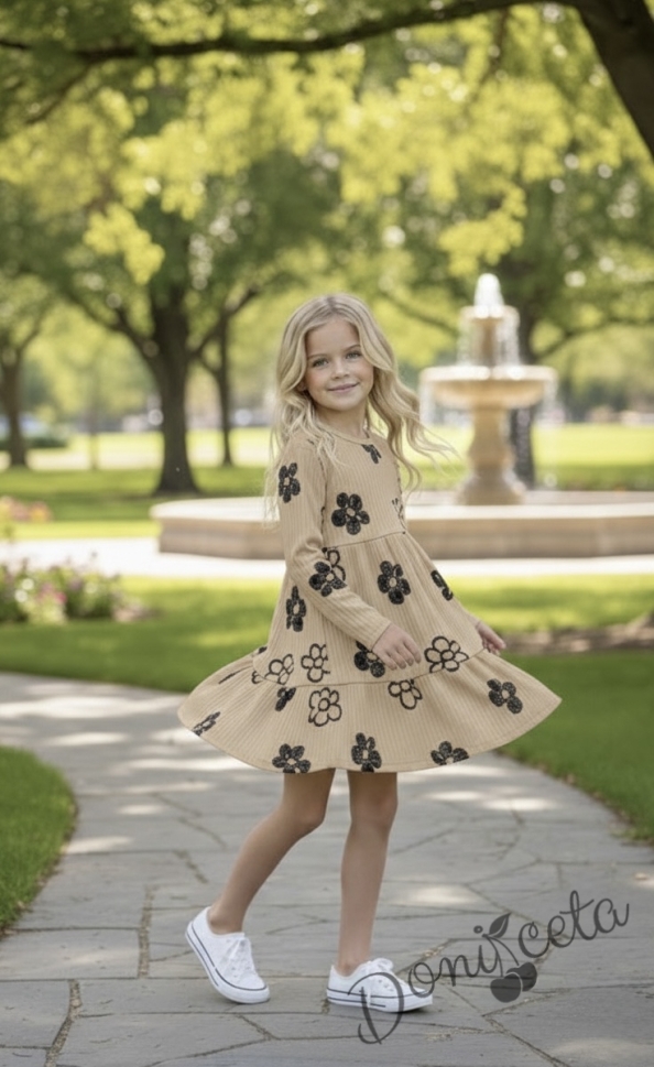 Рипсена детска рокля в бежово с дълъг ръкав и цветчета
