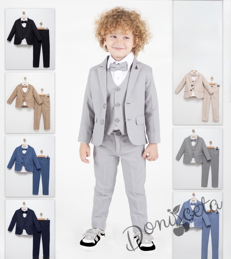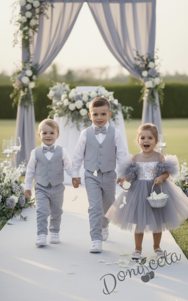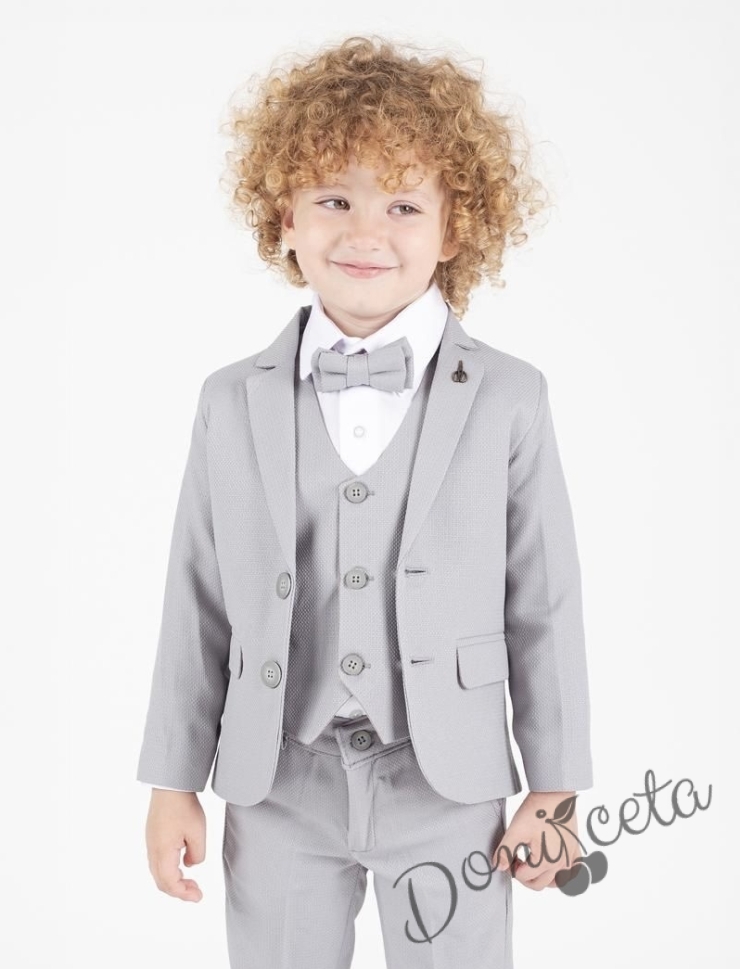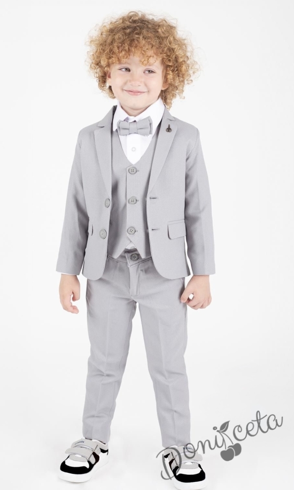 Официален сив костюм за момче от 5 части с риза, сако, елек, панталон и папийонка в сиво