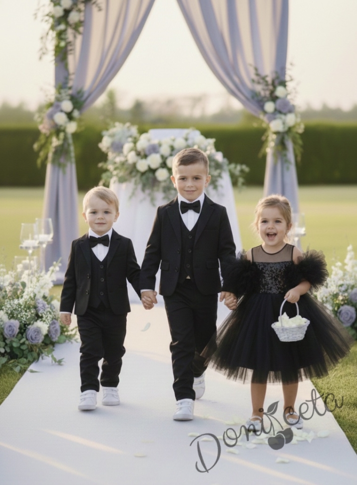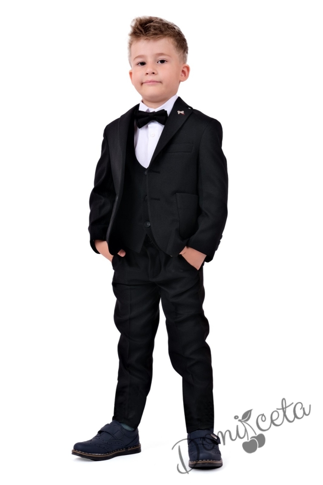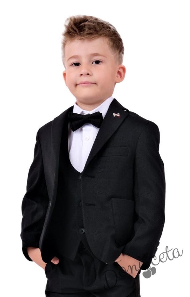 Елегантен официален костюм за момче от 5 части в черно със сако и елек