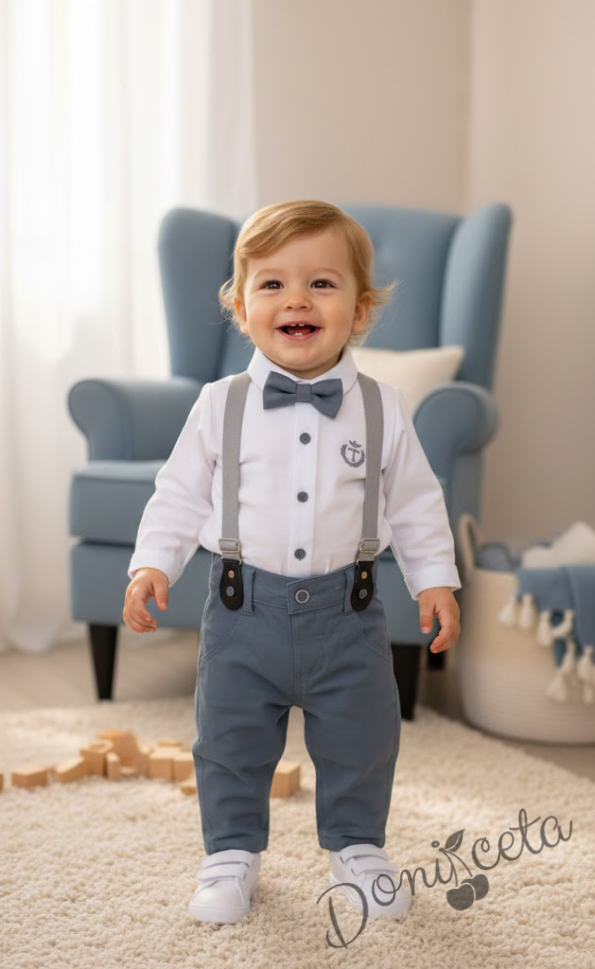 • Много стилен бебешки комплект за момче от ризка в бяло, панталон в сиво, тиранти и папийонка.