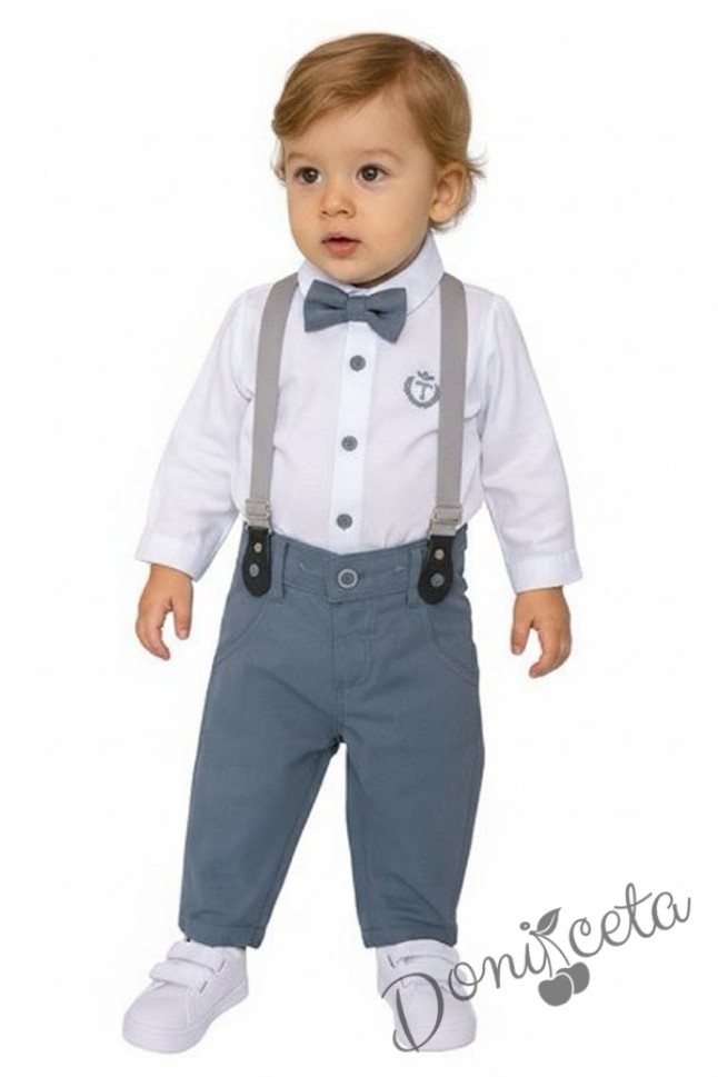 Бебешки официален комплект от панталон в сиво, боди-ризка в бяло, тиранти и папийонка