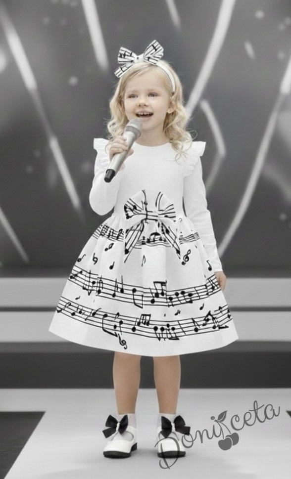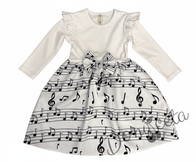 Детска рокля с дълъг ръкав в бяло с къдрички на ръкавите и ноти в долната част