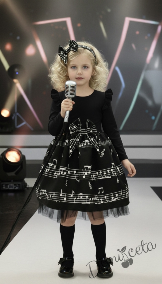 - Весела детска рокля с дълъг ръкав от трико в горната част в черно и с ноти и тюл в долната част.