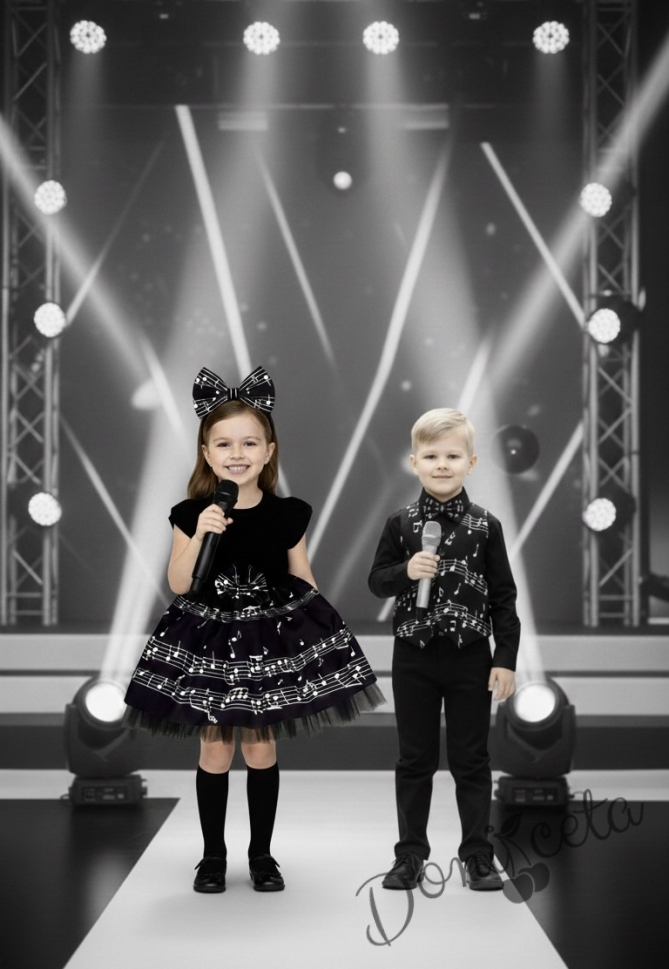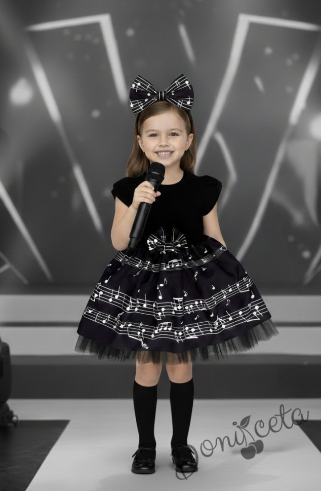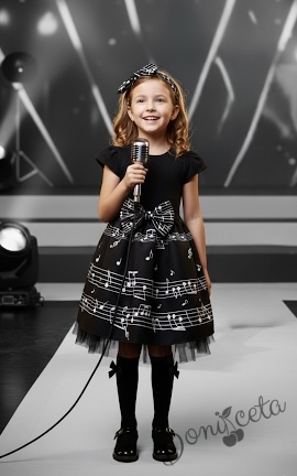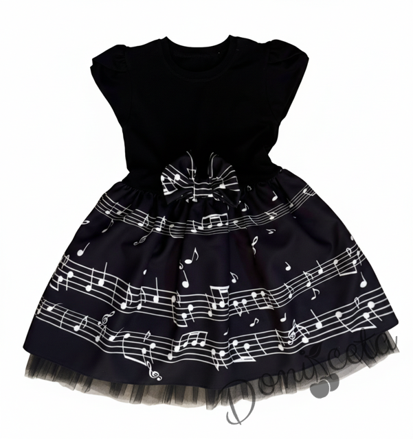 - Весела детска рокля с къс ръкав от трико в горната част в черно и с ноти и тюл в долната част.