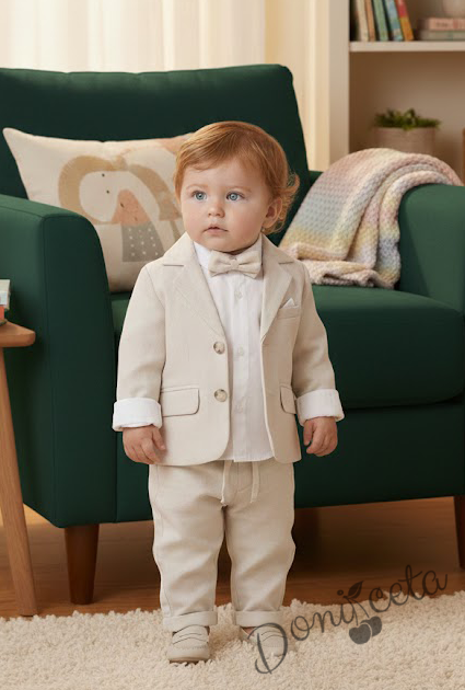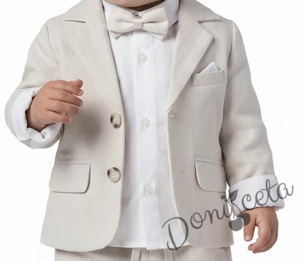 Бебешки комплект от 4 части за момче-сако в бежово, боди-риза в бяло и панталон в бежово с папийонка