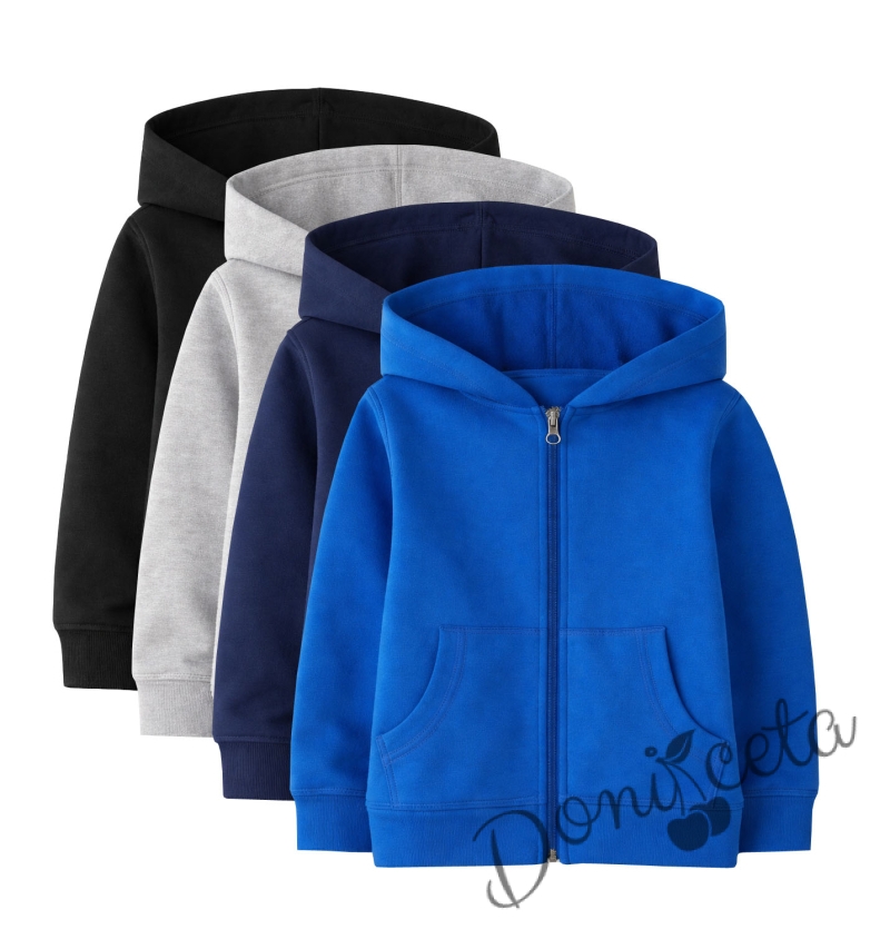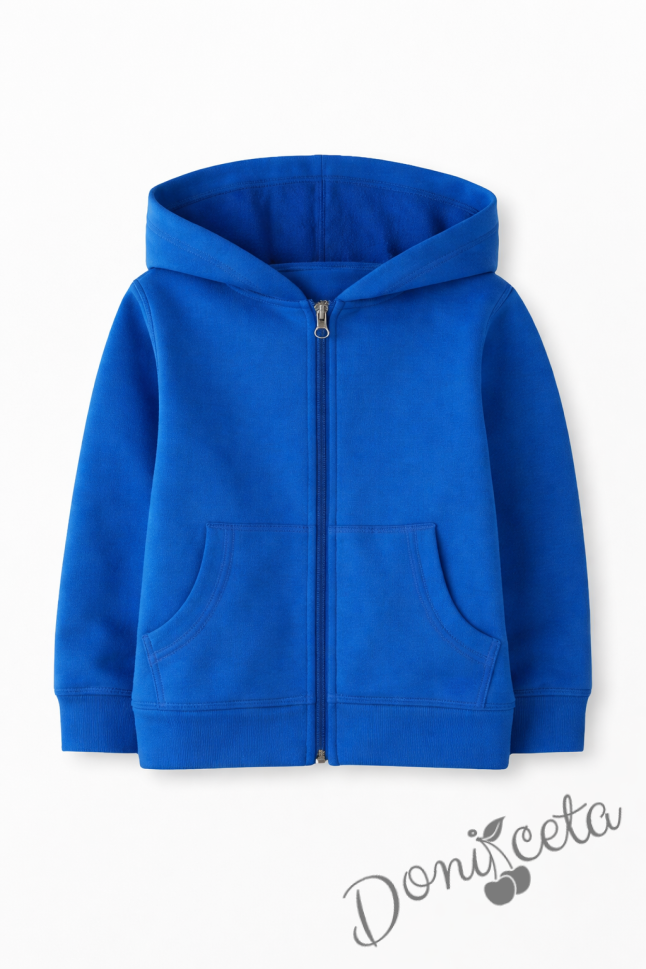 - Изчистен неватиран суитшърт с цип и дълъг ръкав в синьо за момче или момиче, подходяща за униформа.