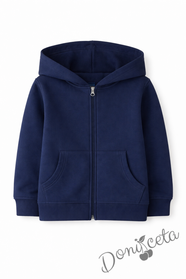 Ватиран детски суитшърт с цип и дълъг ръкав в тъмносиньо, подходящ за момче или момиче и за ученическа униформа