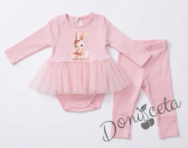 Бебешки комплект рипс от 2 части- боди-рокля в розово с тюл и картинка зайче и панталонки