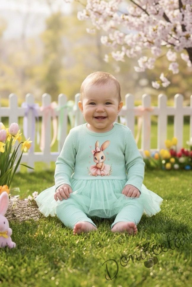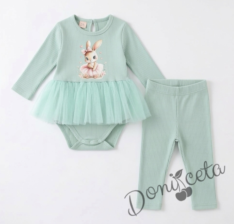 Бебешки комплект рипс от 2 части- боди в тюркоаз с тюл и картинка зайче и панталонки в тюркоаз