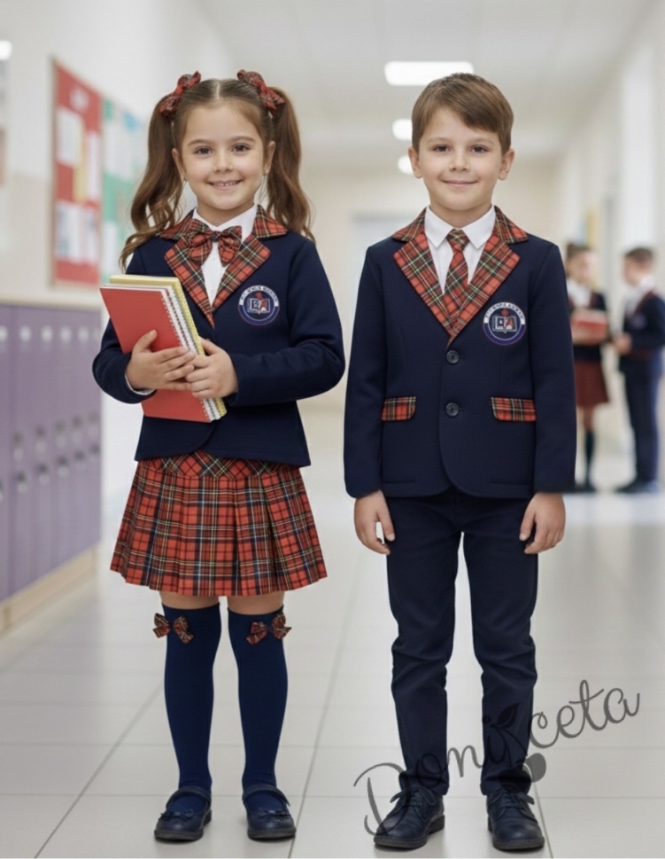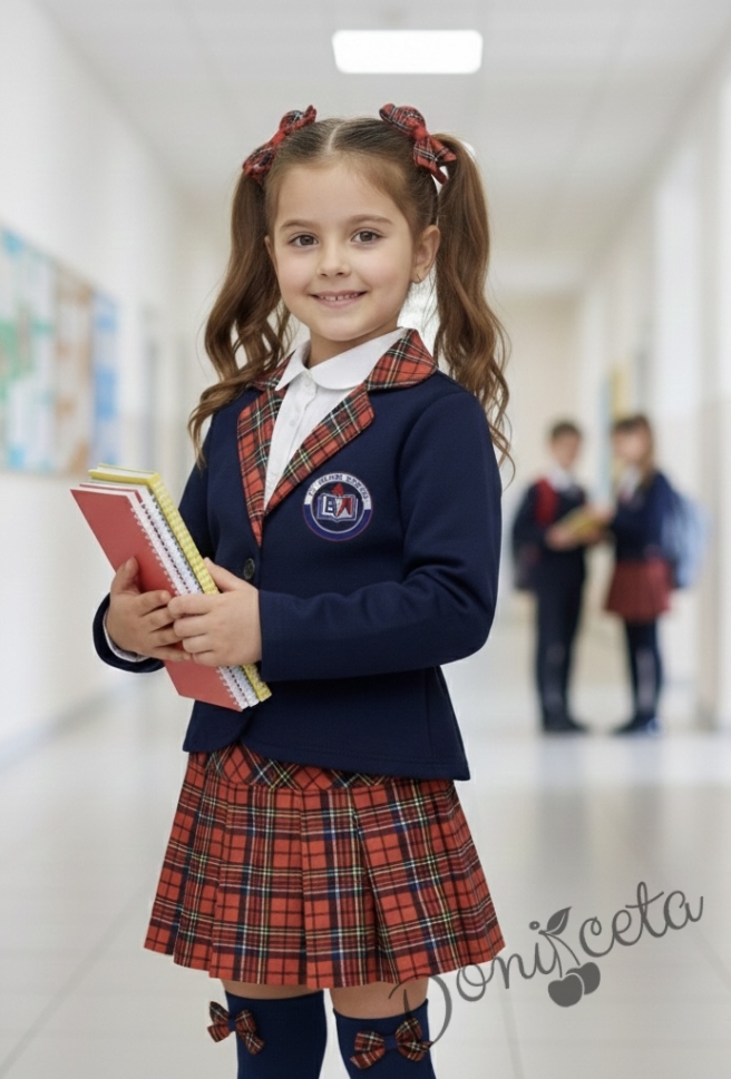 - Прекрасен комплект от трико за момичета от пола плисе в червено и тъмносиньо каре и елегантно сако в тъмносиньо с елементи на каре.