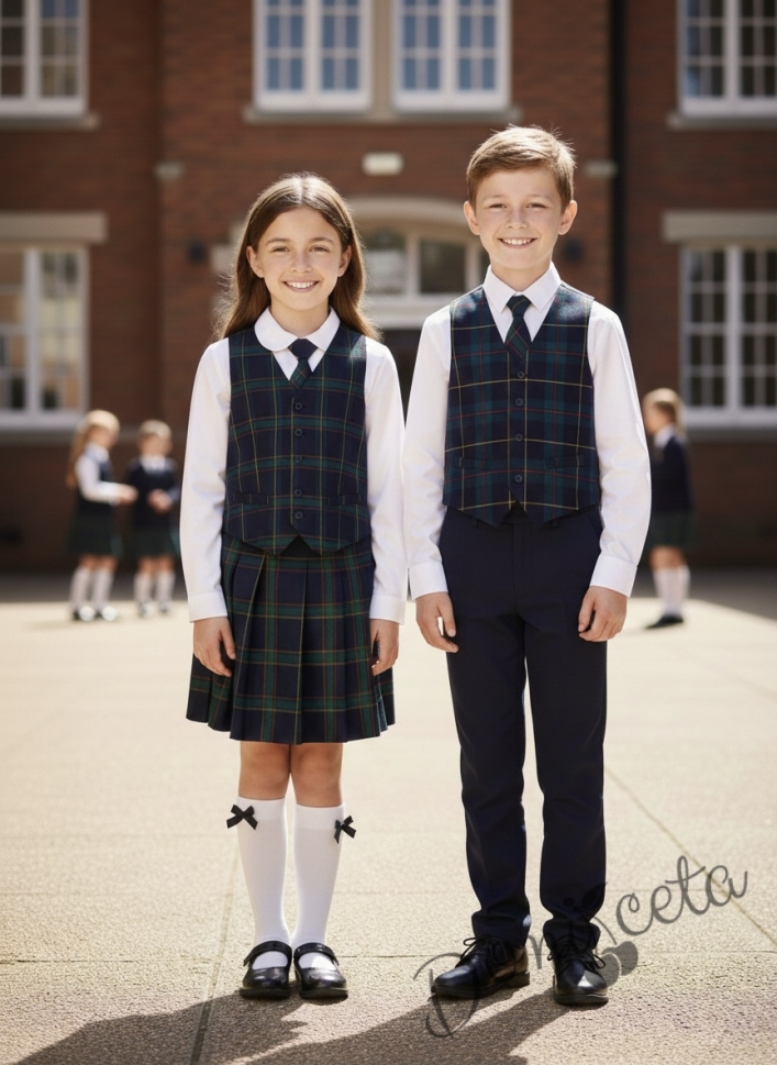 Кариран елек за момиче в тъмносиньо и зелено, подходящ и за ученическа униформа
