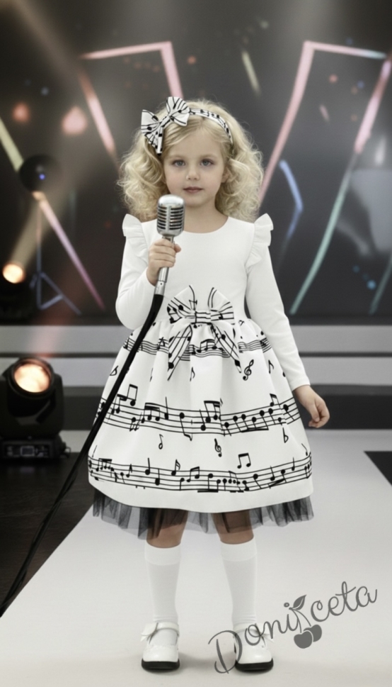 Детска рокля с дълъг ръкав в бяло с ноти и тюл в долната част