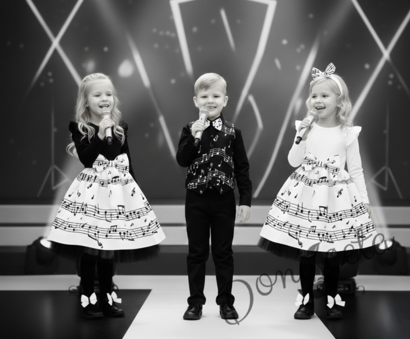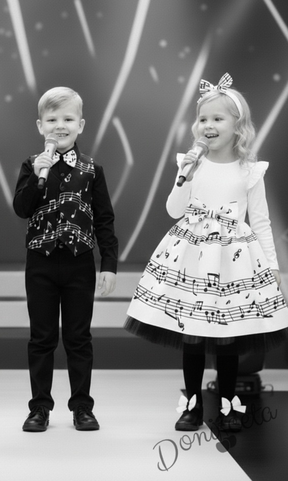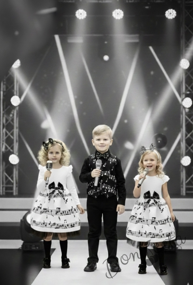 - Весела детска рокля с дълъг ръкав от трико в горната част в бяло и черно с ноти и тюл в черно в долната част.